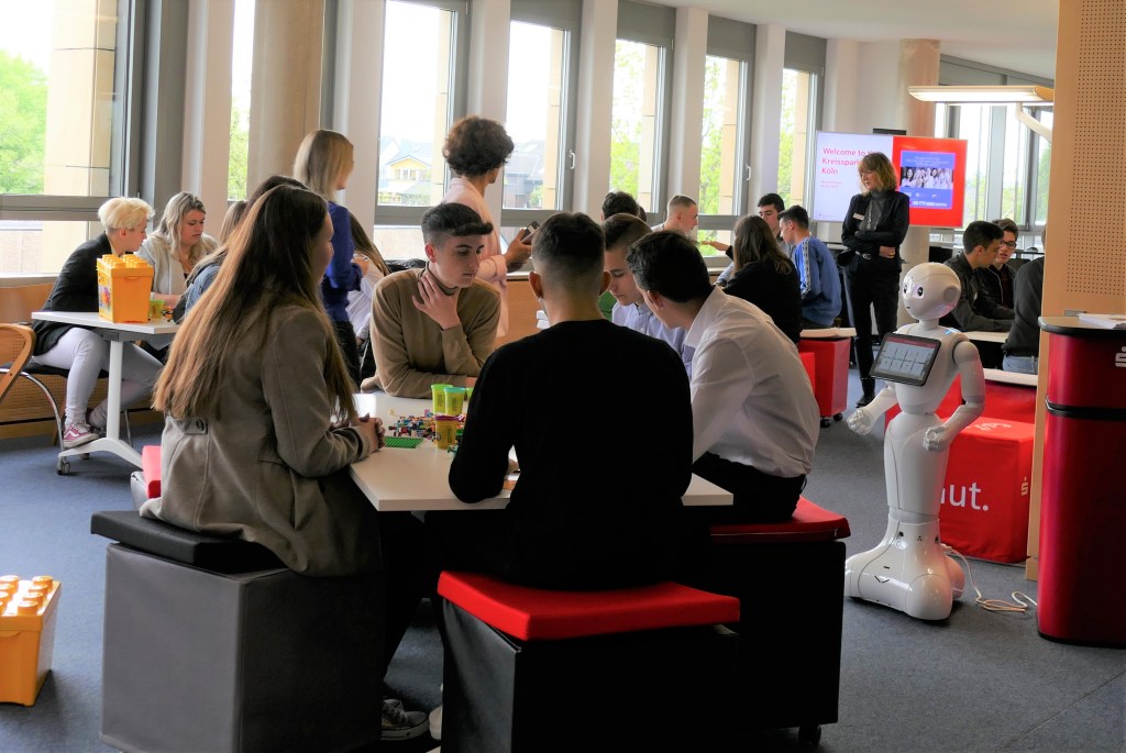In Schulen ist das Management-Tool Scrum nicht bekannt, deshalb baten wir Unternehmen um Unterstützung, um mehr über diese Methode zu erfahren. Die Kreissparkasse Köln stellte uns einen Scrum-Workshop mit dem Titel „Bau einer Marsmission“ zur Verfügung, bei dem die Schülerinnen und Schüler eine Stadt auf dem Mars mit Legosteinen und Bastelmaterial bauen mussten. Sie mussten die gesamte Infrastruktur schaffen, die zum Leben auf diesem Planeten notwendig ist. Zuerst entschieden sie über die Gebäude und ihre Größe und legten sie in den Rückstand. In mehreren Sprints schufen sie die Gebäude. Nach jedem Sprint gab es eine Überprüfung und eine rückblickende Bewertung, bei der die Schülerinnen und Schüler lernten, für den nächsten Sprint kreativer und effizienter zu sein. Die It-Consultant Firma adesso SE lud uns ein, uns einige ihrer Projekte vorzustellen, in denen sie digitale Prozesse für Unternehmen erstellt und implementiert haben und dabei Scrum eingesetzt haben. Die Studenten hatten dort auch die Möglichkeit, an kleinen Projekten zu arbeiten, um mehr über Scrum, die Digitalisierung in Unternehmen und das Design Thinking als Problemlösungsmethode zu erfahren.