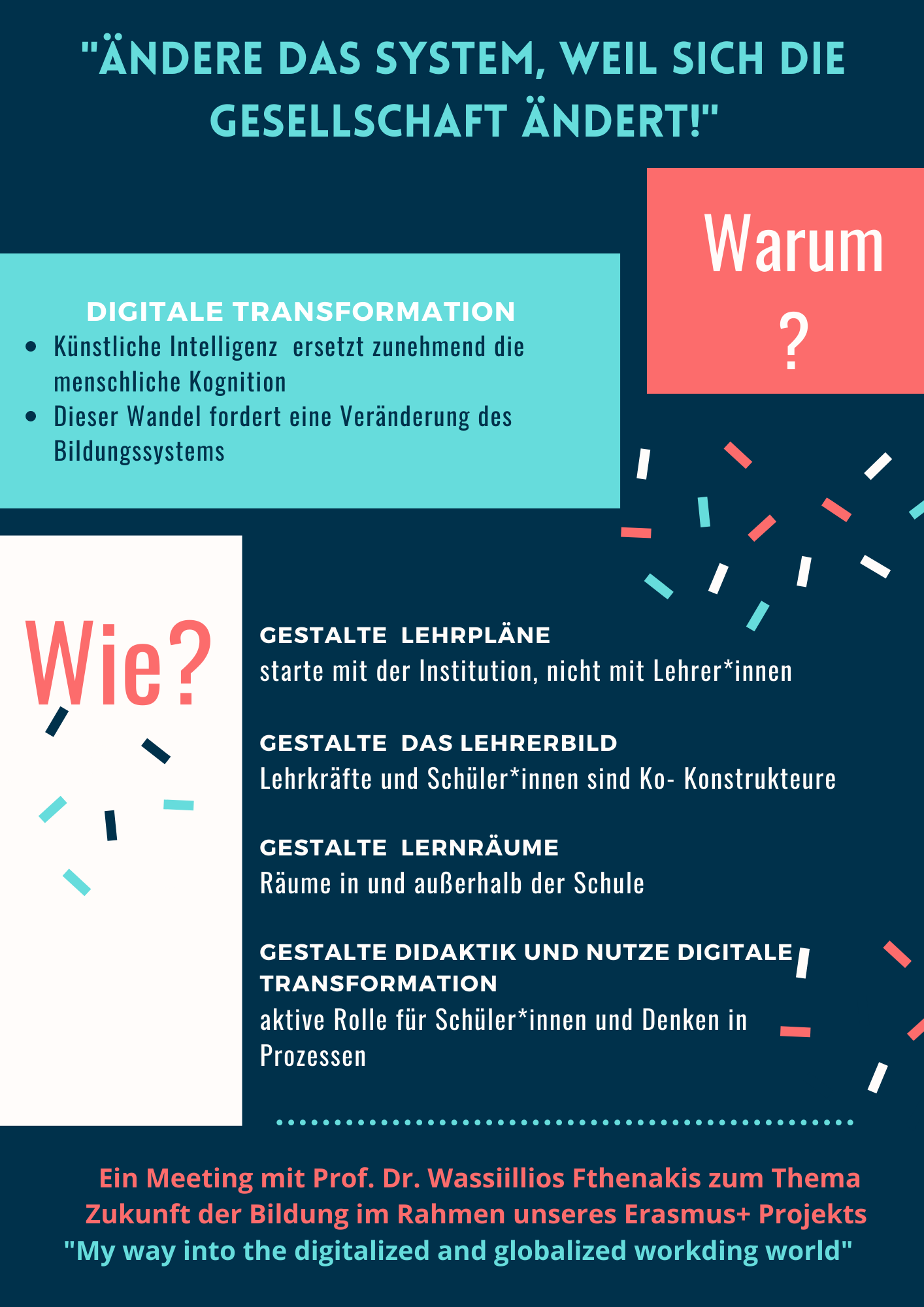 Ein Meeting mit Prof. Fthenakis bei unserem dritten Transnationalen Treffen im Rahmen unseres Ersamus+ Projekts „My way into the digitalized and globalized working world“ brachte hier interessante Erkenntnisse.