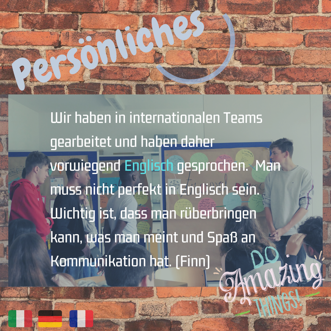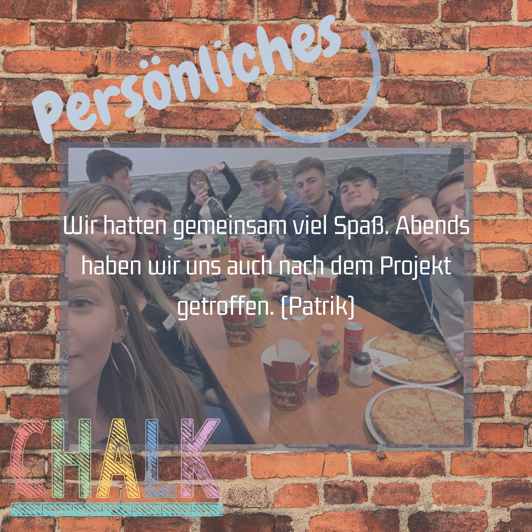Durch die Teilnahme am Projekt haben wir uns mehr Gedanken über Europa gemacht. Wir haben neue Freundschaften geschlossen. Wir konnten erfahren, wie andere Jugendliche leben – wie sie ihre Freizeit verbringen und welche berufliche Perspektive sie anstreben.