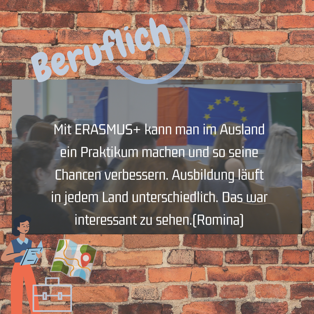 Es gibt viele gute Gründe ein Praktikum in Europa zu machen. Erasmus+ unterstützt dich dabei finanziell. Auch die Kosten für eine Sprachschule werden übernommen. Du musst nur einen Antrag stellen. An unserer Schule helfen wir Berufsschülern, die für zwei bis drei Wochen internationale Erfahrungen sammeln wollen, weiter. Ganz neu ist die Förderung von Praktika in Europa für Schüler*innen des Wirtschaftsgymnasiums und der Höheren Handelsschule.